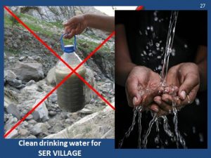 Das extrem entlegene SER VILLAGE (750 Einwohner, 150 Häuser) liegt am westlichen Fuß des NANGA PARBAT. Das Dorf hat im Sommer eine proble- matische Trinkwasserversorgung und im Winter eine extreme Wasserknappheit. Das vom Gletscher kommende Wasser hat keine Trinkwasserqualität und ist für die Bewohner gesundheitsgefährdend. Am ostwärtigen Ende des Dorfes fließen aus einer Quelle täglich ca. 70.000 l mit Trinkwasserqualität. Dort wird das Wasser geschöpft und in Krügen zu den Häusern gebracht. Das bedeutet für die Familien im Westen des Dorfes einen Fußweg von 2 ½ km, 500 m Höhenmeter bergauf und mit den gefüllten Krügen wieder bergab.