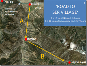 Der Transport wird in drei Phasen erfolgen. Zuerst ca. 400 km mit LKW von ISLAMABAD über den KARAKORUM HIGHWAY bis BUNER DASS, dann 10 km über eine Jeep-Road mit 4 X4 Jeeps bis DIMROI, zuletzt 12 km über einen schmalen ausgesetzten Pfad zu Fuß und/oder auf Eselrücken zum SER VILLAGE.