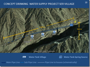 An der Quelle wird ein großer Wassertank das bisher einfach abfließende Wasser sammeln. Über zwei Hauptpipelines von je 2 Zoll (in einer Tiefe von 3 Fuß) wird das Wasser zu 3 kleineren Wassertanks bis in die Nähe der westlichen Ausläufer des Dorfes fließen. Von den 3 Wassertanks werden kleinere Pipelines (3 Zoll und 1/2 Zoll) jedes Haus erreichen.