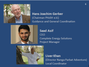 Das Projekt wird unter Anleitung und Koordination durch den Vorsitzenden PAKISTAN-Hilfe zur Selbsthilfe e.V. geplant und durchgeführt. Vor Ort wird der CEO Complete Energy Solutions (ISLAMABAD) als Projektleiter von dem lokalen Koordinator, dem Director NANGA PARBAT ADVENTURE PAKISTAN beraten und unterstützt. Darüber hinaus wird ein von den Dorfbewohnern gewähltes Local Commitee dem lokalen Koordinator und dem Projektleiter beratend zur Seite stehen.