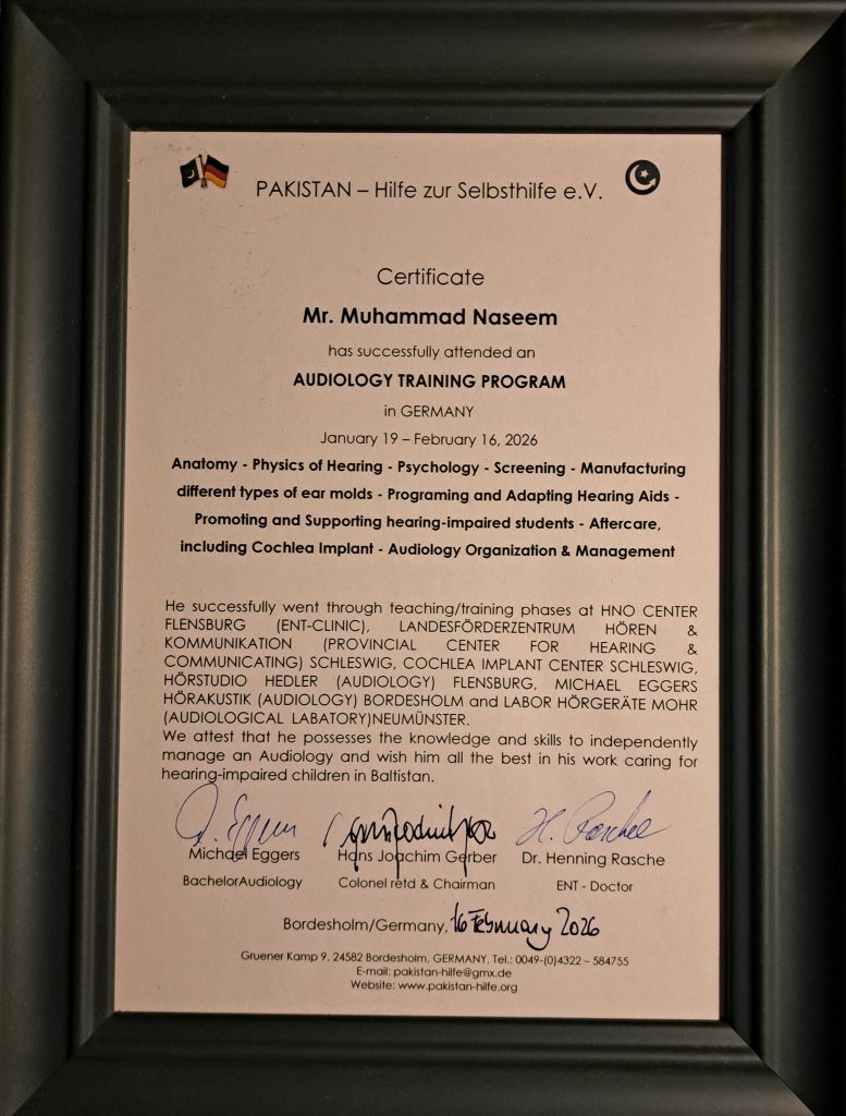 Unserem Motto Hilfe zur Selbsthilfe folgend hatten wir Muhammad Naseem, den wir bei unserem Partner Narjis Khatoon School for Deaf Skardu vor Ort zum Audiologist „grundausgebildet“ hatten, zu einem vierwöchigen Audiology Training Program nach Deutschland eingeladen.